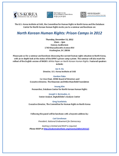 Jae Ku, director of the U.S.-Korea Institute at SAIS; Gordon Flake, co-vice chair of the board of directors at Human Rights North Korea and executive director of the Maureen and Mike Mansfield Foundation; Insung Kim, researcher at the Database Center for North Korean Human Rights; Joseph Bermudez Jr., senior analyst at DigitalGlobe’s Analysis Center; and Greg Scarlatoiu, executive director of the Committee for Human Rights in North Korea, discussed this topic. Keynote remarks were delivered by Carl Gershman, president of National Endowment for Democracy, during lunch following the panel discussion.